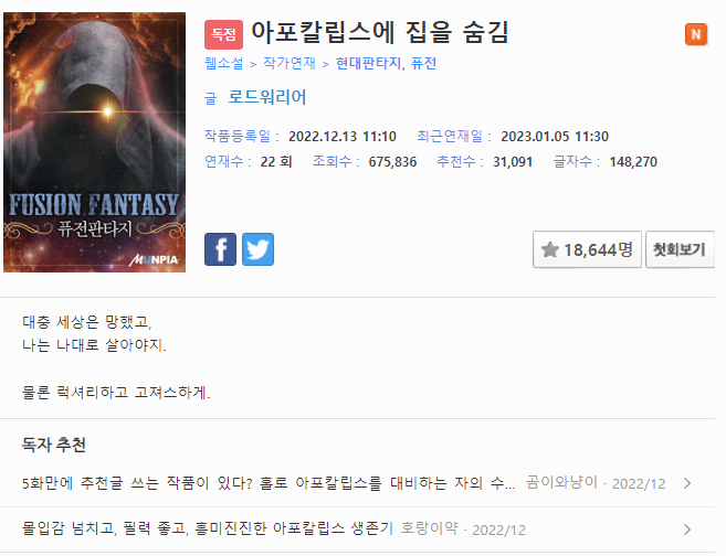 오랜만에 재밌는 웹소설이 나온 것 같다. 초반 몇 화까지는 솔직히 긴가민가 했다. 이게 왜 재밌다고 하는 거지? 아포칼립스를 왜 대비한다는 거야? 시점은 왜 이리저리 뒤바뀌는 건가.