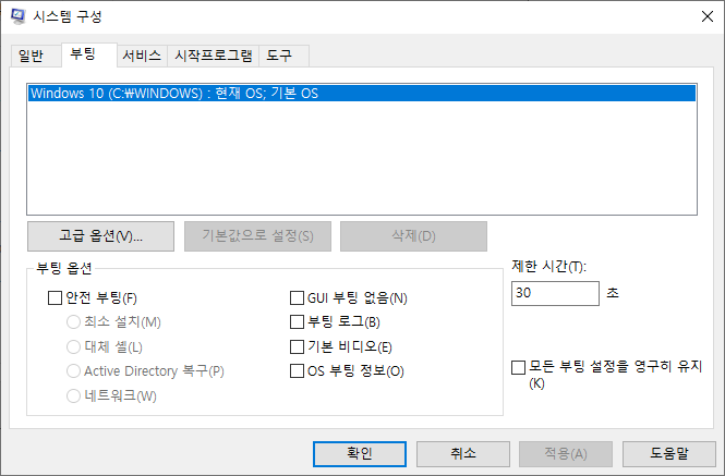 여기서 부팅을 클릭하면, 안전 부팅을 체크하는 항목이 있습니다. 만약 안전모드 -> 정상 부팅으로 바꾸시려면 안전 부팅에 체크 박스를 해제해주시면 됩니다. 그리고 안전모드로 부팅하시려면, 안전 부팅을 체크 하시고 실행하시면 됩니다. 안전모드는 윈도우에 방해가 되는 프로그램은 모두 실행되지 않기에 바이러스 검사시에 탁월한 속도를 경험할 수 있습니다.