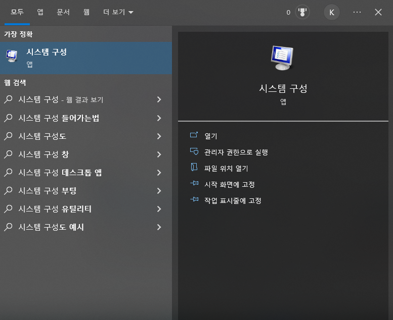 윈도우 검색창에서 시스템을 검색합니다. 시스템 구성을 검색해도 됩니다. 하지만 시스템 <띄워쓰기> 구성을 하지 않으면 윈도우 자체 검색이 아니라 인터넷 브라우저로 검색하기가 될 수 있으니 주의하시길 바랍니다. 시스템 구성을 클릭하여 실행합니다.