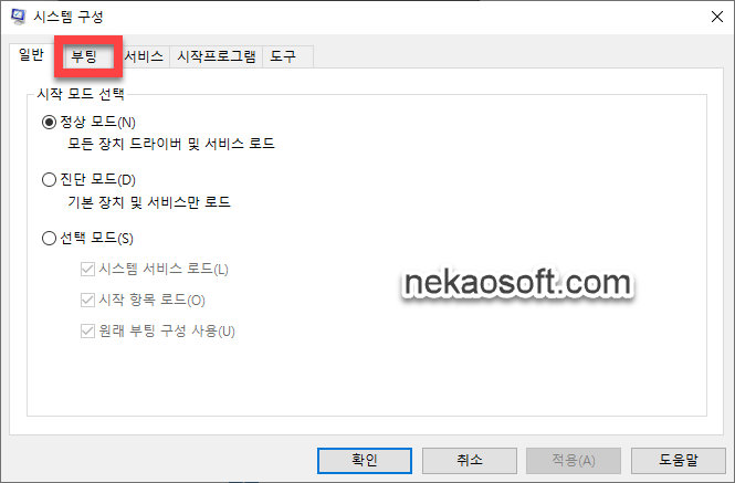 시스템 구성에서 시작 모드를 선택할 수 있습니다. 부팅을 눌러줍니다.